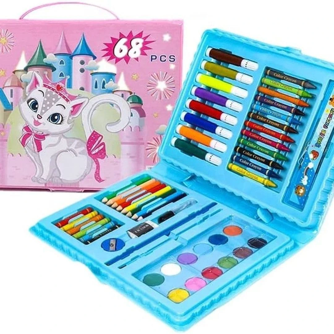 An art colouring kit is a box or set that contains different colouring and drawing items. These kits are specially designed for kids and usually include colour pencils, crayons, sketch markers, watercolours, drawing sheets, eraser, sharpener, and sometimes stickers or colouring books.